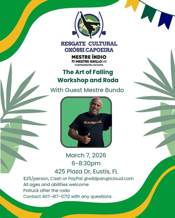 A 2.5 hour workshop and Roda with Mestre Bundo on the Art of Falling and Recovery in Capoeira.
